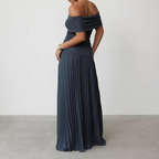 • Diseño: Maxi vestido premamá con hombros descubiertos y falda plisada